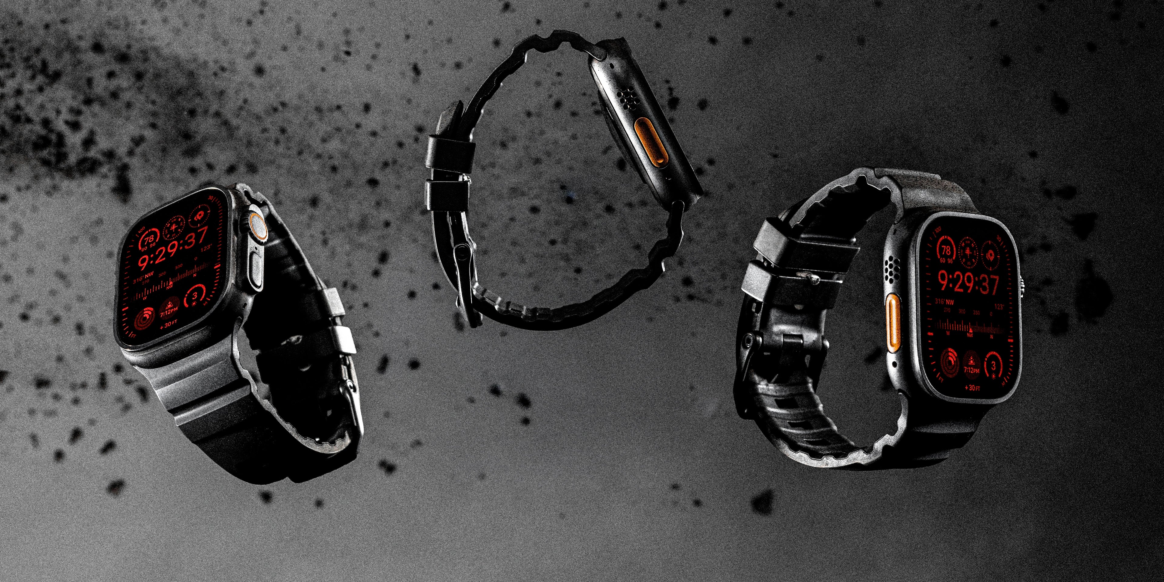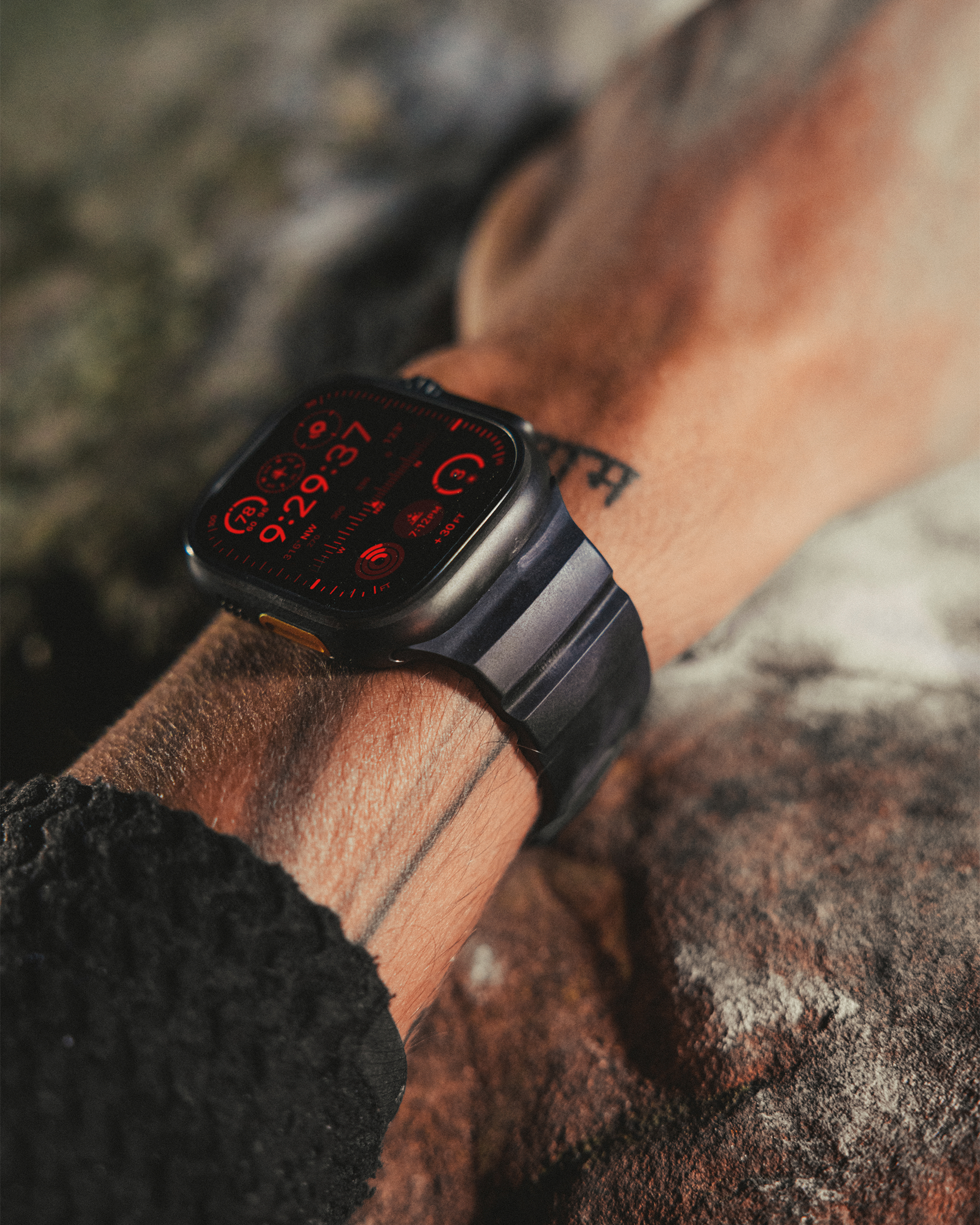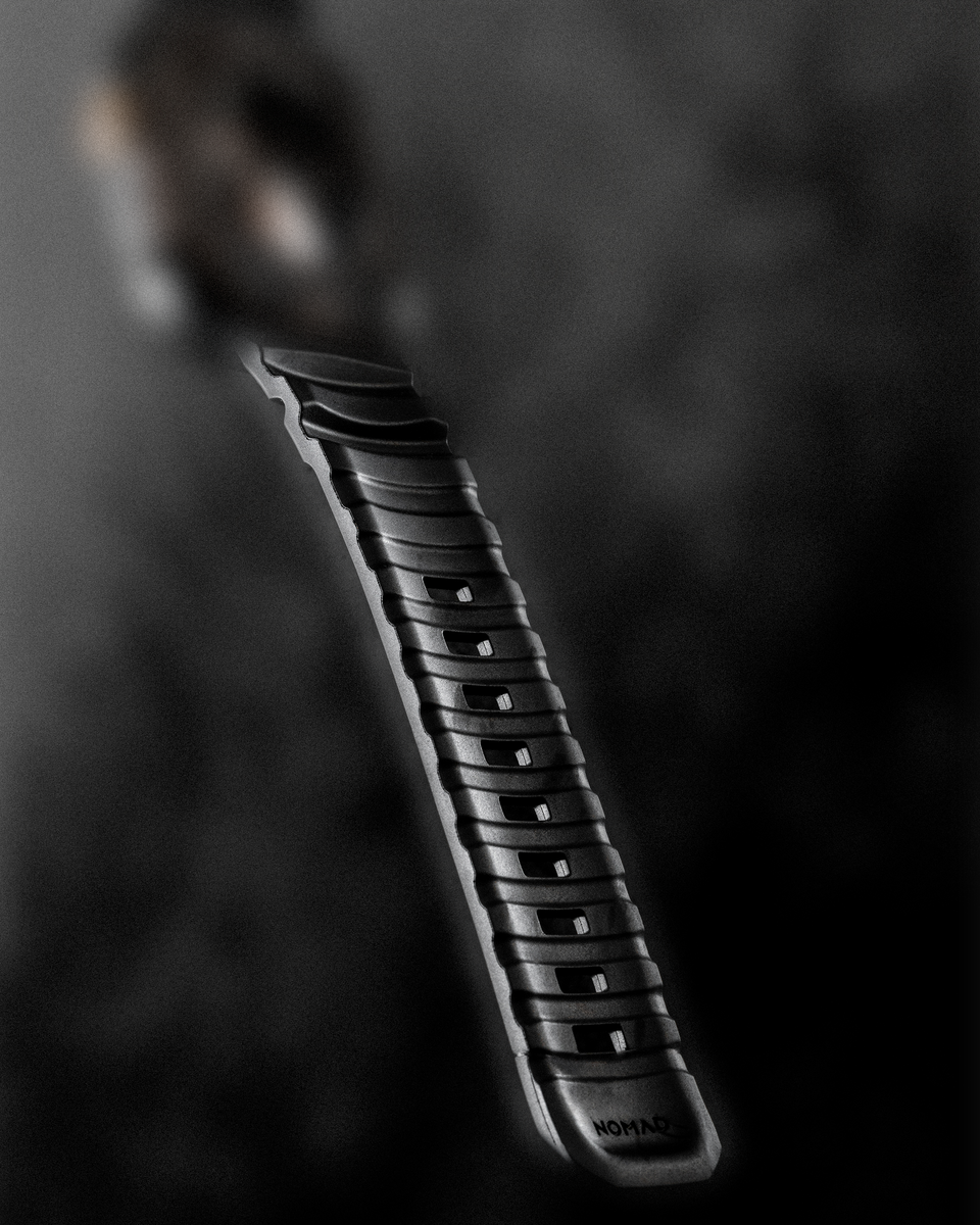 Discover the Carbon Black Nomad Rocky Point Band - a special edition infused with carbon powder for the deepest black finish, available with natural titanium or black titanium hardware to complement your Apple Watch. Ideal for active individuals who demand reliability and comfort, these bands deliver a secure, lightweight fit that feels natural throughout the day. Whether during workouts or daily routines, they enhance your wrist with understated elegance and lasting performance.