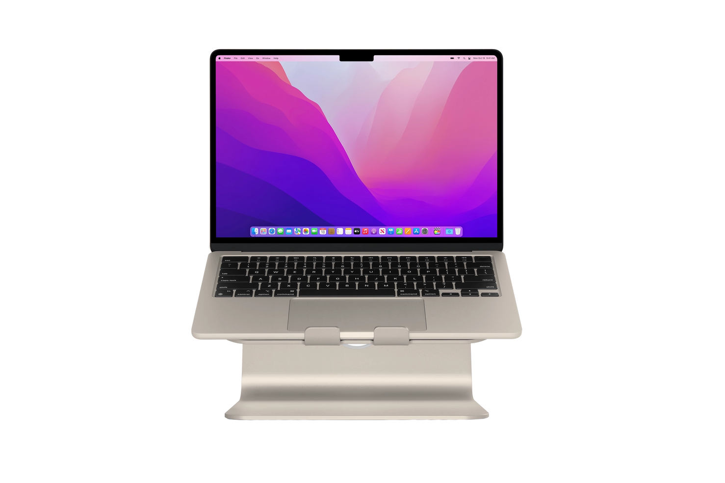 Transform your MacBook into a stable and ergonomic workstation that adapts to your way of working. The integrated swivel allows you to share your screen with colleagues instantly, while the raised and tilted design brings the display to eye level to reduce neck strain. This elevated position also improves airflow to keep your device running efficiently during intensive tasks. Crafted from solid aluminium, this stand keeps your workspace organised and steady, providing a comfortable setup for productive work and seamless collaboration.